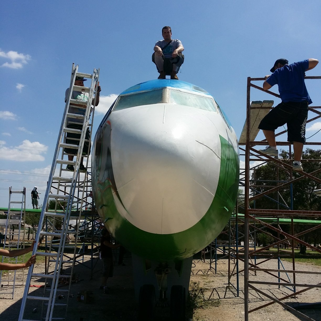 L’équipe présentée nous pouvons commencer à peindre l’avion….Enfin commencer, juste le temps de se concerter et d’attendre les échafaudages qui auront mis 3 jours à venir à nous.